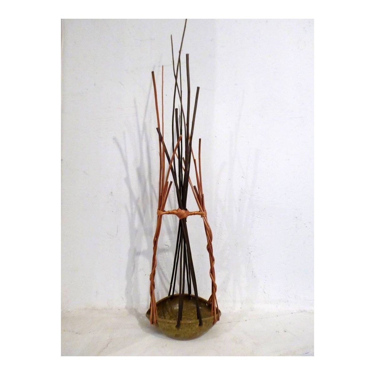 Pieza única, decorativa/escultórica. La parte baja es una pieza de cerámica torneada y deformada posteriormente. Tiene tres partes de mimbre, dos de mimbre buff y una parte central de mimbre negro. Atado en la parte superior con tireta de mimbre buff.